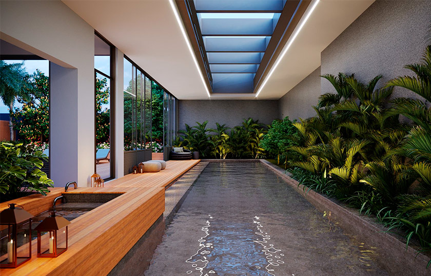 Piscina coberta, deck, fitness, jardim lateral, salão de festas, espaço gourmet, brinquedoteca